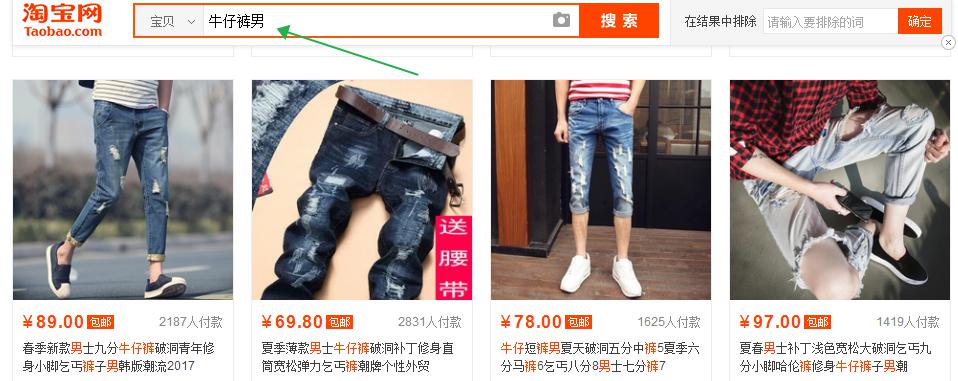 比如说上面的几款产品,都是通过“牛仔裤男”搜索出来的热卖款,在价格完全不一样的情况下,这些产品是否还有其他的相同点。都能够出现在“牛仔裤男”的首页,所以这些款式身上的属性是能够符合绝大部分搜索“牛仔裤男”来的人群。所以只要我们能够找到这些产品之前的共同点,就往热卖款更进一步。