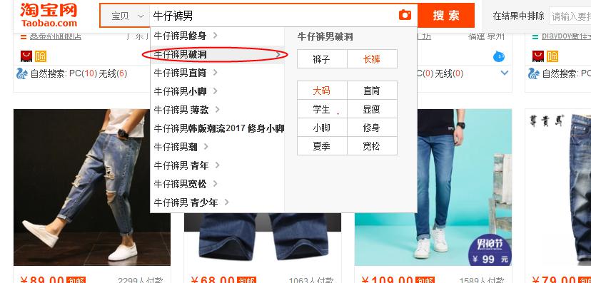 可以看到“破洞”的属性确实是最近搜索热度比较强的,要不然淘宝也不会把这个词放在下拉框第二个。