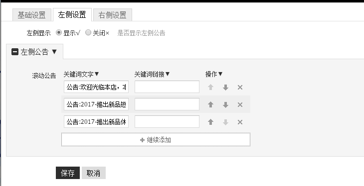 我们要注意店招高度不应太大大概110左右。店招的左侧设置可设置公告滚屏和超链接,右侧设置可设置图片广告与超链接,并且可以添加客服旺旺。