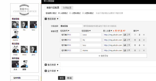 在图中我们看到可以设置名字与旺旺的链接,还可以上传客服头像图片,但需要注意大小。