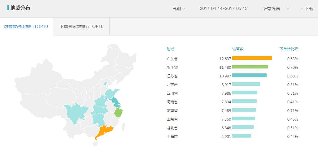 在地域这边我们直接能看到自己店铺的,访客和销售TOP10城市