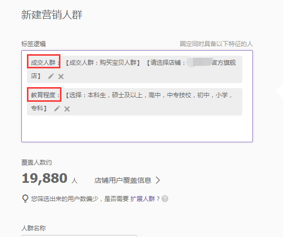 先拉一个最近老客标签,在用户轨迹-营销关系,如果店铺人群数比较少,可以选择认知客户(近180天内有店铺访问、收藏、加入购物车,但是没有购买行为的用户群体。)如果店铺人群数比较多,可以选择成交用户(180天内在本店铺成功购买过宝贝的人群)。