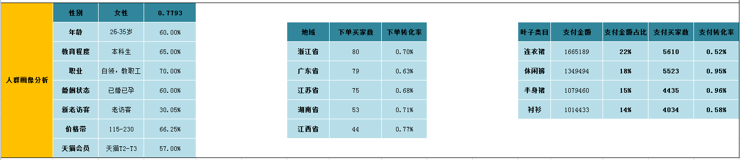 说明这是一家女性为主,年龄26-35岁,已婚已孕,有知识文化,白领,分布在一二线城市居多,并且,喜欢买新款,喜欢搭配,对这家店铺有比较高的认知,粘性比较强。