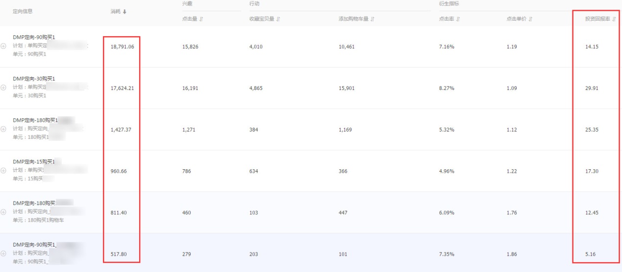 2. 在定向的选择上面,因为客户的粘性比较好,当我们在上新的时候,我们对于30天有购买的,7天15天有收藏的,就可以加大预算去投放。
