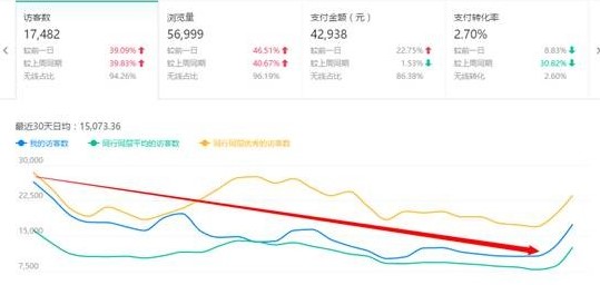 上图为一店铺店铺访客数,该店铺的DSR呈现持续下降现象,目前店铺访客数已经由原来的1万7跌到了9千。