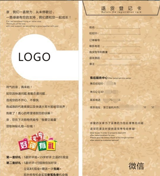 ⑴ 提前准备售后卡片,随包裹一同寄去,通过文案引导买家给我们五星好评(如:生活不易,且行且珍惜,您的满意是对我们最大的支持,希望我能收到您的五星好评,谢谢!)