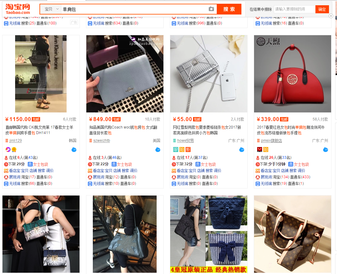 我们知道能够描述一个产品的核心词有很多,举个例子。上图宝贝我们能想到什么词来描述它?单肩包?小挎包?小圆包?这些都是他的核心词吗?现在我们去将他们放入搜索框去搜索。