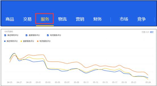 这个你可以在生意参谋的服务模块里面看到你的DSR变化趋势,点击评价概况就可以了。DSR评分也是动态变化的,所以可以确定的是单日的上升或者下降是不会影响自然搜索排名的,除非一下子绿了,否则都是量变引起质变,持续的上升或者下降,会影响商品的自然搜索排名。所以,你同样要安排你的运营每天关注你的DSR评分,当出现持续四五天下降的时候,必须及时进行处理,把评分拉回来。