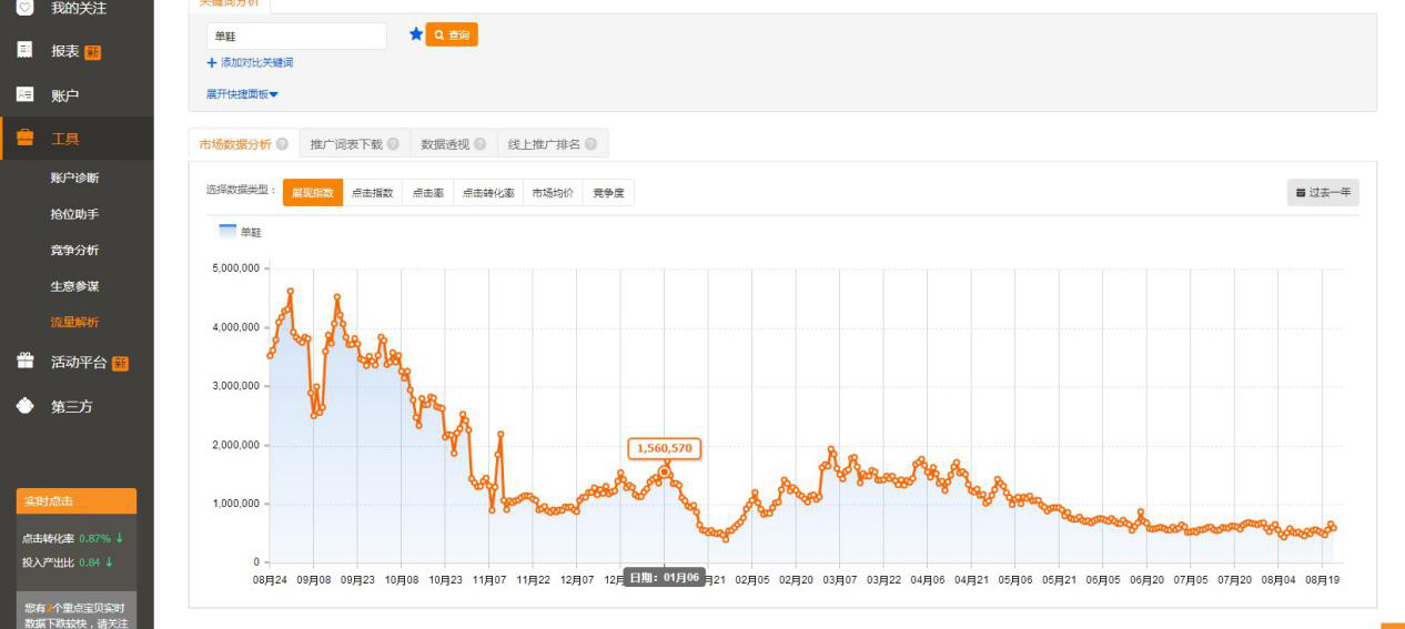 用凉鞋女为例。打开卖家中心的我要推广—淘宝直通车—流量解析输入凉鞋女,时间选择过去一年,我们会得到如图所示的一张数据图,