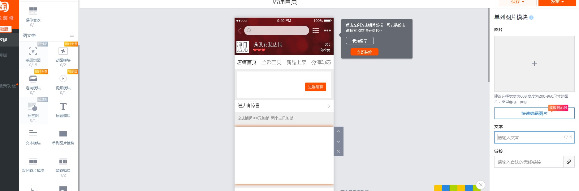 2.单列图片模块。我们可以添加一个单列宝贝模块,其实这个模块跟标题模块有点类似,唯一的区别就是多了一张图片,我们可以先做好这张图片,上传到这里之后编辑它的文本内容,文字也要足够的吸引人,文字展示是在图片上,下面就是添加链接,也就是点击图片后的二级页面。