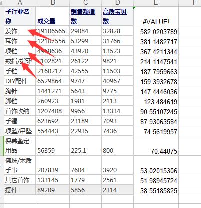 通过这个表格我们一目了然可以看出来,发饰是销量最高的,其次是耳饰,然后是diy配饰,当我们再去做饰品的时候是不是优先选择这些类目来做呢?不一定,对不对,为什么,因为除了销量这个因素之外,淘宝代运营还有竞争度,接下来我们再来看一组数据